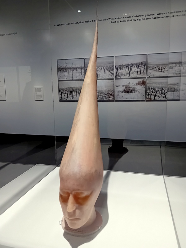 Sehr gut gefiel mir die skulpturale Arbeit der Künstlerin Dvora Morag, die mit einem Selbstportrait als „Hexe“ in der Ausstellung vertreten ist. Mit diesem historischen Bezug wollte sie offenbar einen misogynen Verfolgungskontext hervorheben, der auch für die Shoah relevant ist. Der aus Kunstharz geschaffene Kopf erinnert an eine morbide Kerze.