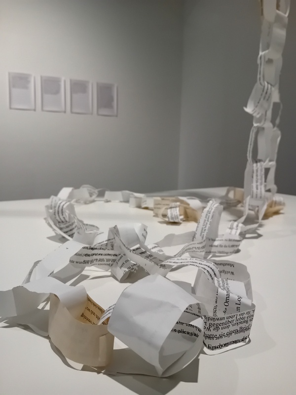 Obsessiv wirken tatsächlich viele, wenn nicht die meisten der auf zwei Etagen ausgestellten Arbeiten. Sie zeugen seitens der Vertreter*innen der 3G von einer ausgeprägten Suche nach Verbindung, die nunmehr stärker, meine ich, als individuelle Wahlmöglichkeit (weniger als erlittene „Neurose“) in den Blick genommen werden kann. Auch wird der Einfallsreichtum in den Ausdrucksformen für Erinnerungen deutlich, die mithin nicht die „eigenen“ waren, mitunter eigene entwerten oder gar ersetzen konnten: „Die Erinnerungen ihrer Eltern und Großeltern erscheinen wichtiger als ihre eigenen, weil sie von großer historischer Bedeutung sind.“ (S. 17)