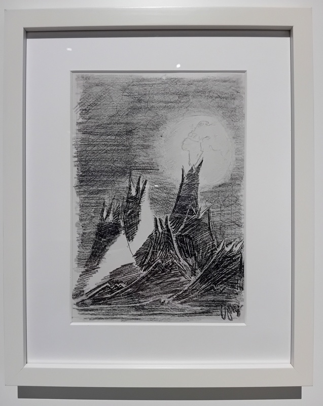 Mit einer kleinen und „bezaubernden“ Arbeit beende ich meinen Streifzug. Die Zeichnung „Mondlandschaft“ des jungen Theresienstadt-Gefangenen Peter Ginz, der 1944 in Auschwitz ermordet wurde, hat eine ebenso tragische Nachgeschichte: als Kopie 2003 von dem israelischen Astronauten Ilan Ramon mit ins All genommen, verbrannte sie mit diesem beim Wiedereintritt des Shuttles.