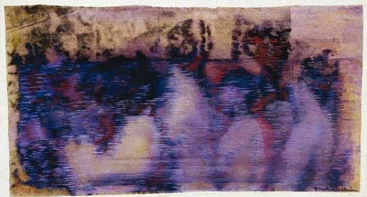 In einem der Bilder benutzte Ettinger, die Kunst als „transport-station of trauma“ fasst, übrigens „Asche“ als Malmittel. Für die Ausstellung in München wurden zwei sehr abstrakte Werke ausgewählt. Dieses Bildbespiel lässt die Vorlage (nackte Frauen mit Kindern in Misotsch) besser erkennen: