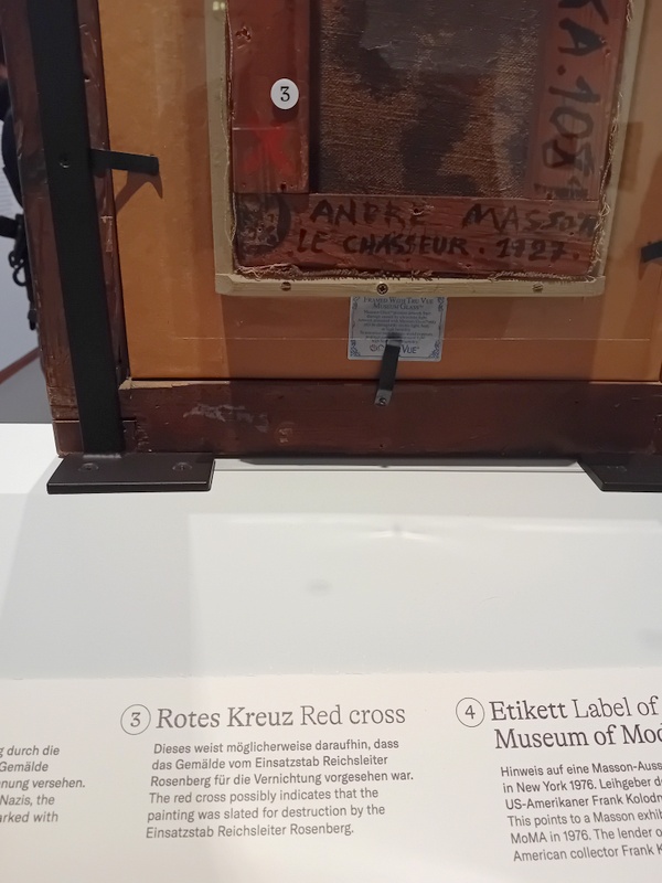 Der kuratorische Ansatz verdeutlicht die fluchtbedingte geografische Bewegtheit der Kunstwerke, ihr Flottieren durch die Institutionen und Sammlungsbestände: Zum Teil sichtbar gemachte Rückseiten der Leinwände entpuppen sich als Flickenteppich von Datierungen und Siglen der (vorübergehenden) Eigentümer*innen. Im Wust der Chiffren wird ein rotes Kreuz als das Zeichen einer von Rosenbergs Stab (eigentlich) angeordneten Vernichtung lesbar.