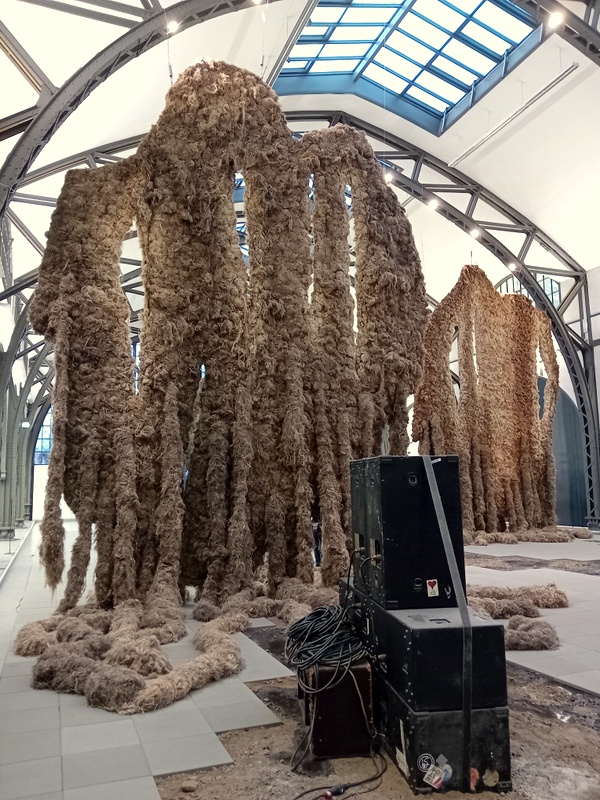 Ausgediente Lautsprecher-Ensembles aus Berliner Technoclubs beschallen den Raum mit osteuropäischer Vokalkunst und kryptischen Texten. Der Eindruck eines Einzuges archaischer Mythenwelten in die Gegenwartskunst setzt sich in den Nebentrakten fort, die man teils durch waldartige Tunnel betritt.