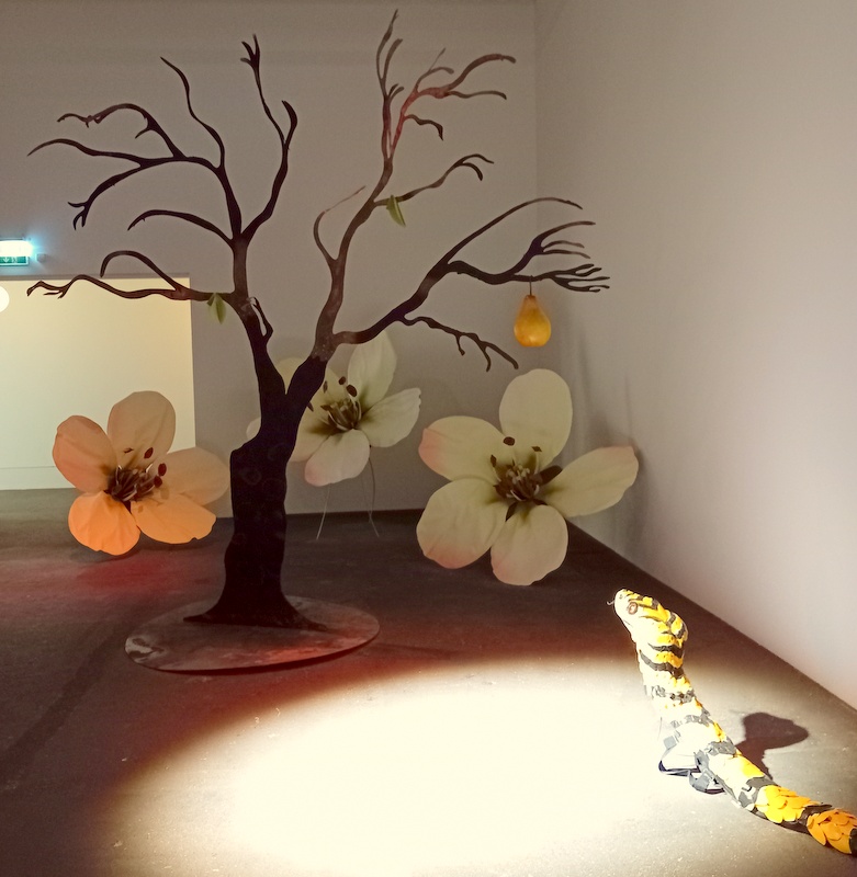 Die mehrere Hallen durchziehende Installation „An Opera Out of Time“ des queeren Kosovaren Petrit Halilaj bewegt sich ebenso in den Übergangsgefilden von Kunst-Natur / Natur-Kunst, bezaubert aber durch Humor, farbenfrohen faunischen Surrealismus und kindlich anmutende Märchenwelt. Inmitten der bunten Chimären zwitschert gar eine possierliche Tier-Oper,