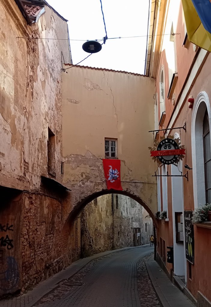 Da ich vom Wege abkam, verlor ich kurzzeitig die hastige Reisegruppe, die unterdessen in einem Hinterhof verschwunden war. Dort saß einst der Judenrat, im Hof stand der einzige Baum des Ghettos. Die Altstadt von Vilnius war einst berühmt für ihre Bögen. Von diesen sind indes nur noch wenige erhalten.