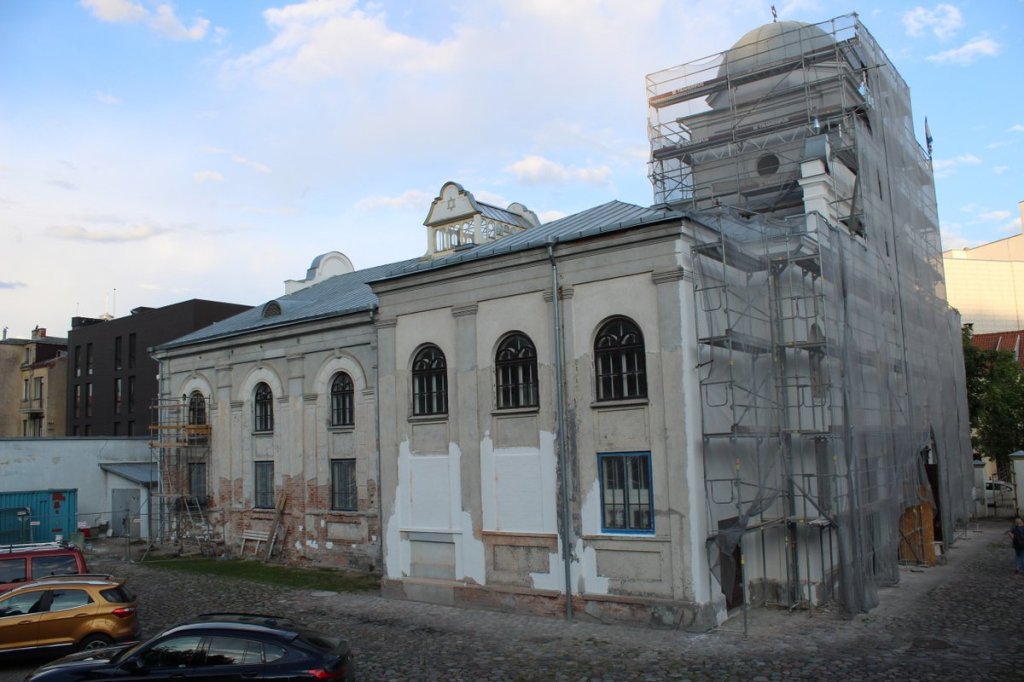 Von den Gebieten der beiden größten Ghettos ging es jeweils folgerichtig zu den ihnen mord-logistisch angegliederten Stätten: für Kaunas/Kowno die zaristische Festungsanlage Fort IX, für Vilnius/Wilna das unvollendete sowjetische Tanklager Paneriai/Ponar. Beide waren für mich, erwartungsgemäß, die beeindruckendsten Punkte der Reise. Orte gegenwärtigen jüdischen Lebens, etwa die Choral-Synagoge in Kaunas, waren Teil des Pensums incl. Führung in jiddischer Sprache wie auch das (mich weniger interessierende) „Sugihara“-Haus. Es ist benannt nach dem als „japanischer Schindler“ bekannt gewordenen Konsul, der bis September 1940 in Kaunas rettende Visa für Jüdinnen und Juden ausgestellt hatte. Die alte Synagoge in Kaunas.