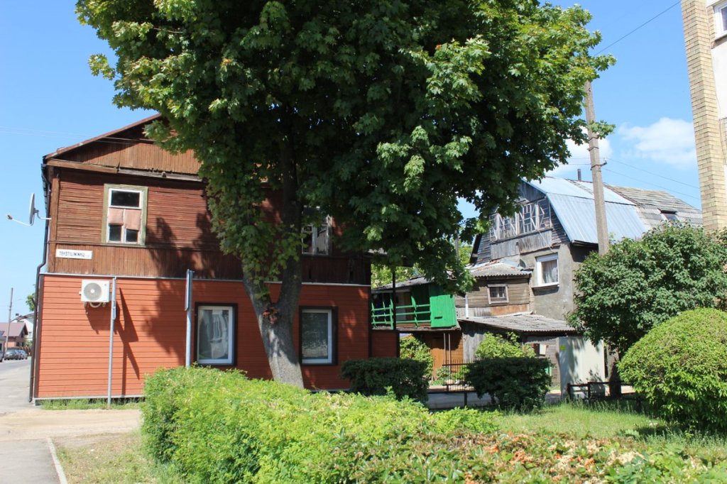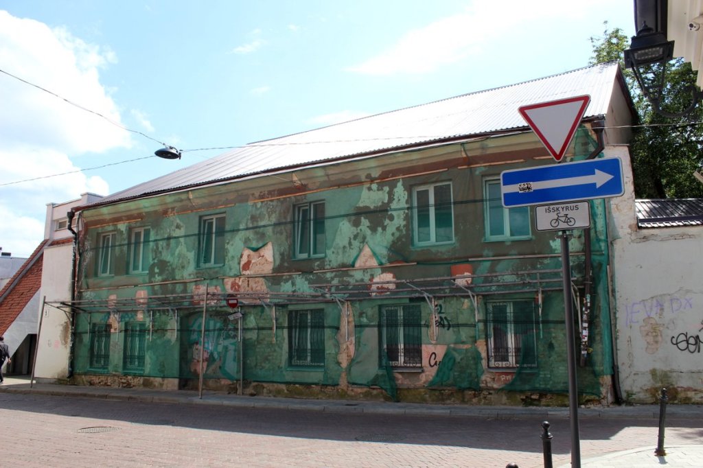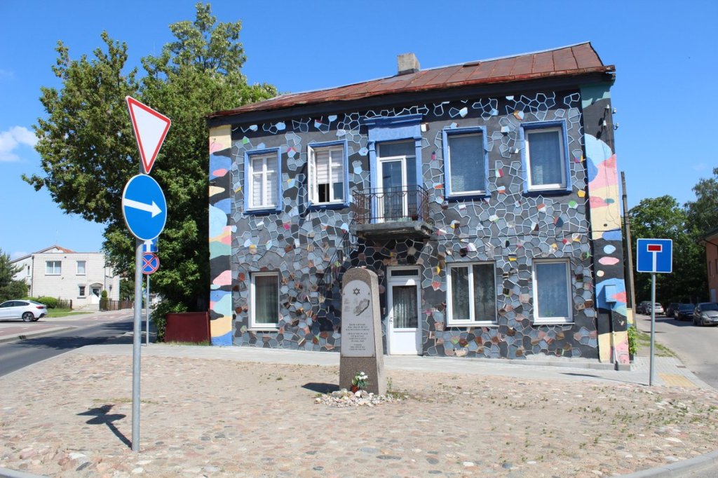 Vom einstigen Ghetto Kowno, eingerichtet im August 1941 im armen Stadtteil Slabodka (auch: Slobodka oder Slabotka), ist heute nur noch wenig zu sehen. Dies ist dem Umstand geschuldet, dass es 1944 systematisch mitsamt der noch in Verstecken („Malinen“) lebenden jüdischen Verbliebenen abgebrannt wurde. Eine lebhafte Vorstellung vom Stil des randständigen Viertels gewinnt man indes noch immer. Neben diesem heute farbenfrohen Haus befand sich der Haupteingang zum Ghetto.