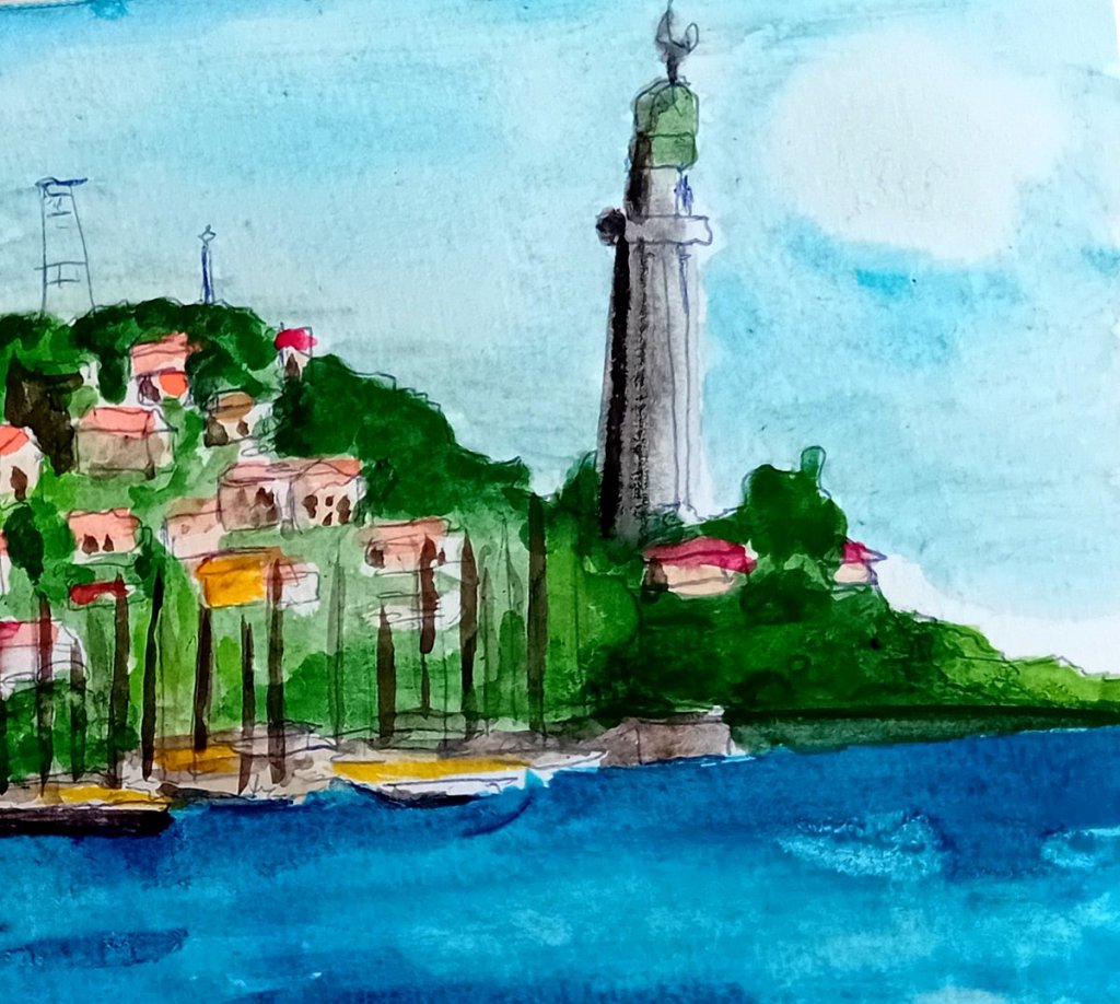 Dem berühmten Oberdan-Platz widmete der slowenische KZ-Überlebende Boris Pahor (wir kennen ihn als Überlebenden des KZ Natzweiler) ein assoziatives Büchlein. Erst im Nachhinein entdeckte ich, dass ich am Triester Stadtstrand „Barcola“, ein bei Einheimischen beliebter kleiner Pinienwald am Meer, ein Motiv malte, das sich auf der ersten Seite der Graphic-Novel-Adaption von Pahors Buch „Nekropolis“ findet (in: Pahor/Devetak, „Nekropolis“, Berlin 2023.)