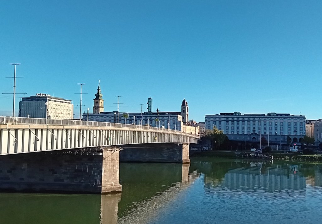 Die markanteste Spur teutonischen Irrsinns in Linz ist die Nibelungenbrücke mit ihrem Zwillingspaar klobiger Brückenköpfe. In ihrem Inneren wuselt nun die Studentenschaft der Linzer Kunstuniversität, gleichsam als Triumph von Kultur und Schönheit über das braune Barbarentum von damals. Ein „Transparenzlift“ erhebt sich einige Meter über das linke Gebäude hinaus. Er war am heiligen Sonntag leider nicht nutzbar.