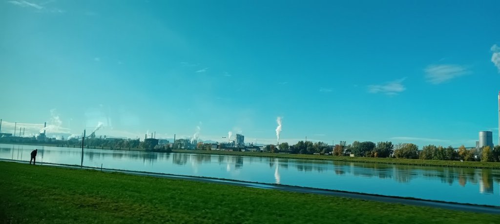 Die Anlagen der ehemaligen „Hermann-Göring-Werke“ spiegeln sich gleißend in der Donau, wenn man, im Bus 360 nach Mauthausen sitzend, an dieser Landschaft dampfender Schlote vorbeifährt.