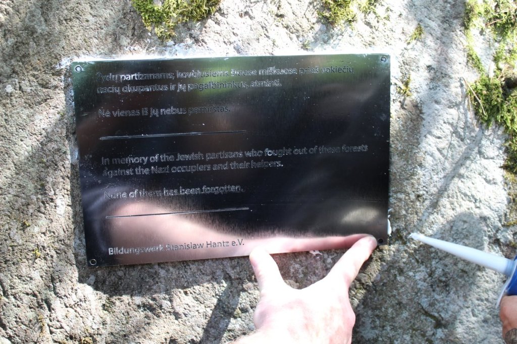 Eine bemerkenswerte und couragierte Gedenkaktion unserer Reiseleiter war zum Abschluss das feierliche Anbringen einer Gedenkplatte an einem Stein. Dieser steht als verwaister, kahler Gedenkstein seit Jahrzehnten im Gehölz. Es war der lang gehegte Wunsch der Organisatoren, die Plakette zu erneuern. Zu dem schönen jddischen Lied „Shtil, di nakht iz oysgeshternt“ wurde die neue Gedenkplatte zeremoniell an den Felsen geleimt.
