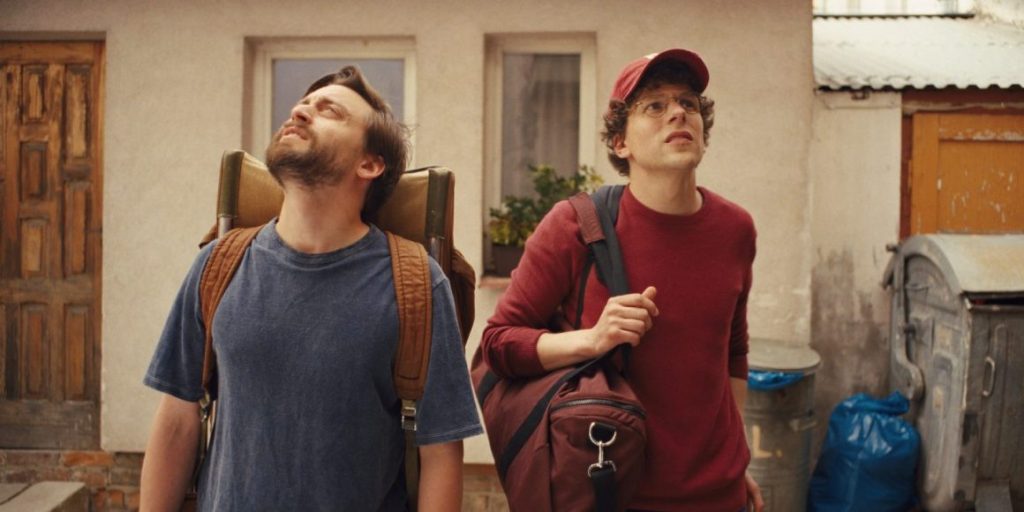 In A REAL PAIN kommen diese Eltern gar nicht mehr vor. Im Interview mit der SZ betonte Eisenberg, dass er als Jude in New York eine gehörige Paranoia und Ängste vor sozialer Interaktion geerbt habe. Und: „Das Seltsame an Paranoia ist, dass sie sich weitervererbt, aber sozusagen ihren Ursprung vergisst.“ Genau dies scheint einer der zentralen Punkte des Films zu sein: die konkrete Bedrohung ist verschwunden, soziales Gleichgewicht ist potentiell möglich, Polen ist eigentlich kein Schreckensort mehr. Dennoch dauert eine psychische Schieflage fort. In einer der letzten Szenen des Films legen David und Benji, etwas ratlos, was sie sonst tun könnten, einen Stein auf die Schwelle des Hauses, in dem einst ihre Dory gewohnt hatte. Ein polnischer Mann auf dem Balkon beschwert sich darüber: Unfallgefahr. Man befürchtet schon eine unangenehme Szene, Antisemitismus. Doch es geht harmlos aus.