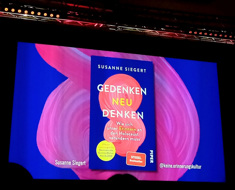 Mein Kommentar hier ist eine Mixtur, ein mediales Potpourri aus Höreindrücken der Radio-Mediathek, aus Video-Schnipseln, einer Lektüre des Buches und dem Besuch der Veranstaltung. Einen Extrakt dessen, was Siegert an der gegenwärtigen „Erinnerungskultur“ bemängelt, bekommt man jedoch am nuanciertesten auf dem akustischen Wege. Mir scheint, die gesprochene Sprache ist ihr Medium. In den Radio-Interviews macht sie klar, dass „Erinnerung“, darauf brachte sie ein Podcast mit Jens-Christian Wagner (Leiter der Gedenkstätte Buchenwald), ein ziemlich schiefer, unpassender Begriff ist. Wer erinnert denn? Und wer erinnert noch? Ist Erinnern nicht eine subjektive Erfahrung, die ein Erleben oder Erleiden voraussetzt? Kann und darf man sich als Nachkomme von Täter*innen des Holocaust an diesen überhaupt „erinnern“? Ist das nicht anmaßend? Siegert zieht den Begriff „Gedenkarbeit“ vor, in dem steckt zugleich die Anstrengung, die mit wirklichem Gedenken einhergeht. Da gehe ich vollkommen d´accord mit ihr.